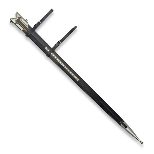 Designed to fit Anduril (UC1380), Anduril Limited edition, and Narsil swords (all sold separately). Genuine leather wrap and straps. Solid metal collar, fittings, plate, and tip. Antiqued metal and 24k gold plated finishes.