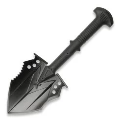 6 7/8″ x 5 1/2″ overall black oxide coated tempered 2Cr13 stainless tool steel shovel head. Shovel point is sharpened on each side featuring a partially serrated edge on one and a concave chopping edge on the other. Also features multiple lashing holes. Black injection-molded nylon handle with 30% fiberglass and nylon reinforcement. Black reinforced nylon belt sheath. Perfect for camping and outdoors use, light chopping or for use as a defensive weapon in an emergency situation.